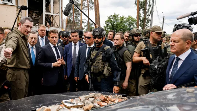 Перед переговорами с Зеленским европейские лидеры посетили разрушенные жилые кварталы Ирпеня в Киевской области.