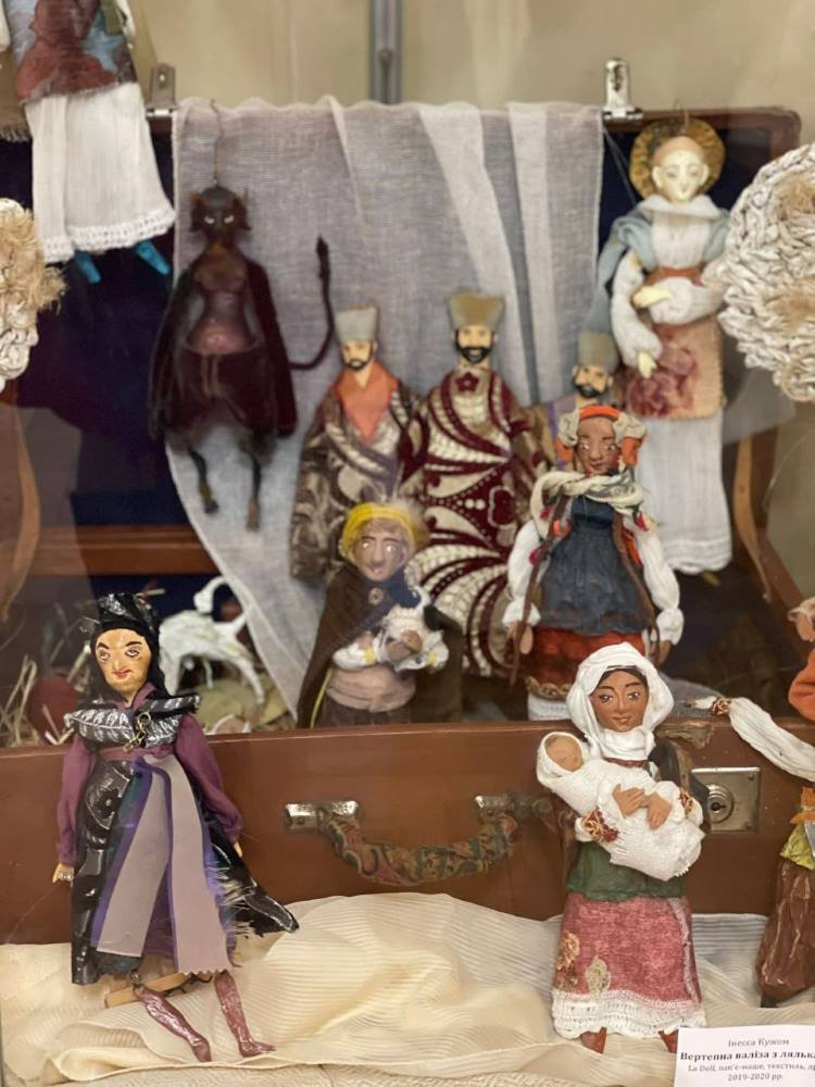 Серед експонатів — живопис, графіка, авторські вироби та елементи народного мистецтва: гердани, намиста, ляльки-мотанки, вертепна валіза з ляльками.
